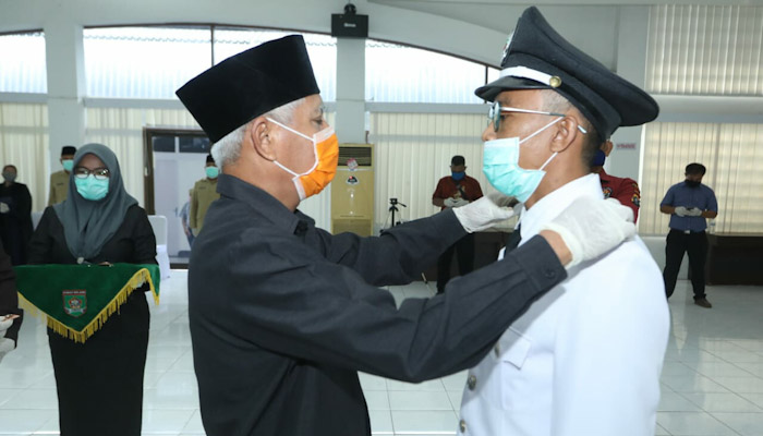 Bupati Asahan H. Surya, BSc melantik Kepala Desa (Kades) Perbaungan Kecamatan Sei Kepayang Arinton Sihotang dan Kades Sukadamai Kecamatan Pulo Bandring Sujadi Pranata di Aula Melati Kantor Bupati Asahan, Kamis (23/04/2020).
