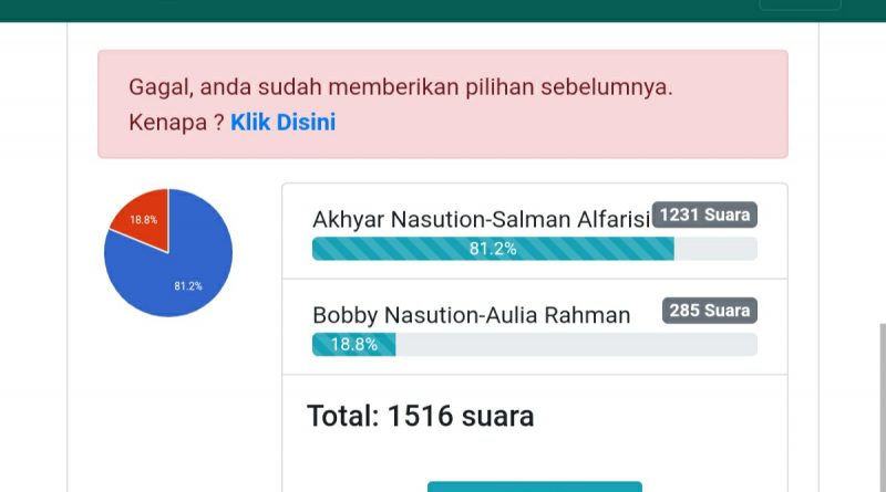 Dari 1516 suara yang memanfaatkan polling ini, 1.231 suara memilih pasangan AMAN. Sementara itu 285 suara memilih Pasangan Bobby Nasution-Aulia Rachman.