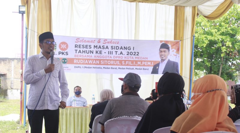 Medan,- Anggota DPRD Medan Fraksi Partai Keadilan Sejahtera (FPKS) Rudiawan Sitorus, S.Fil, M.Pem.I menerima sejumlah masukan dari warga di Dapil I Kota Medan yang meliputi Kecamatan Medan Helvetia, Medan Baru, Medan Barat dan Medan Petisah, saat melaksanakan reses I Tahun 2022, yang dilaksanakan di tiga lokasi diantaranya di Jalan rantang Kel. Sei. Putih Tengah Kec. Medan Petisah, Jalan Pantai Timur Kelurahan Cinta Damai Kecamatan Medan Helvetia, dan Jalan Sekata Kel. Sei. Agul Kec. Medan Barat, Jumat-Sabtu (18/19/02/2022).